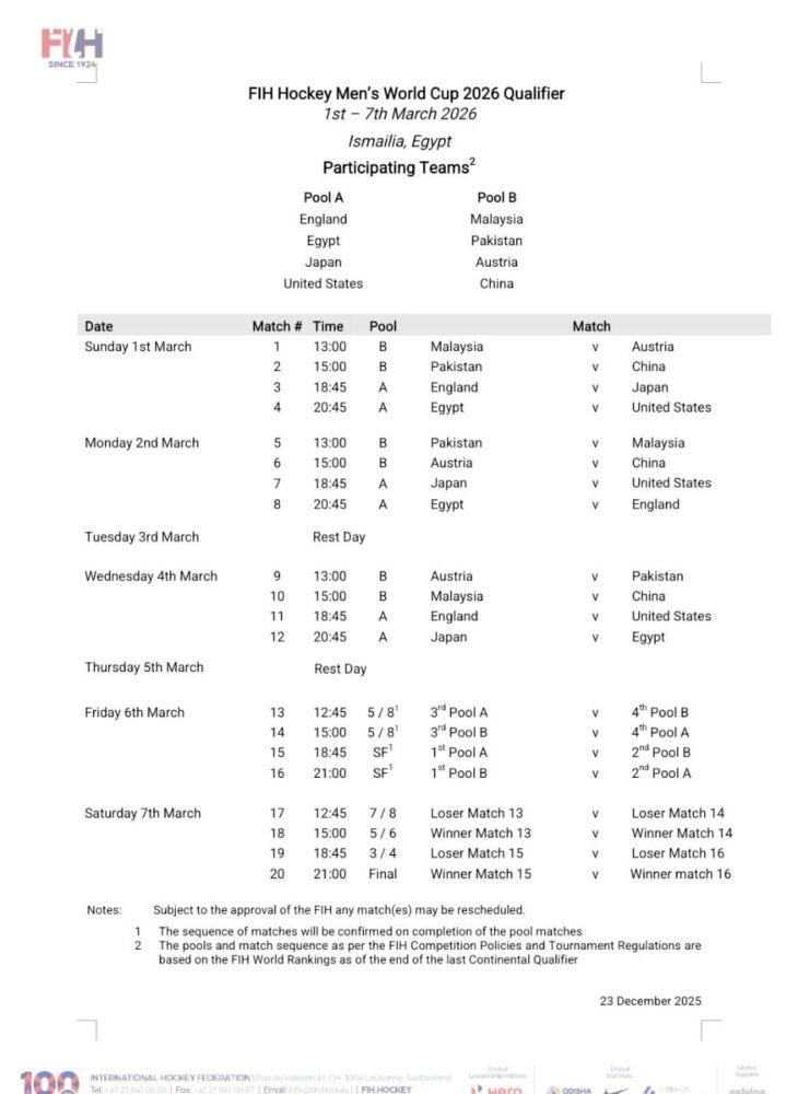 Berdasarkan jadual rasmi kejohanan, Malaysia diundi bersama Pakistan, Austria dan China dalam Kumpulan B, sekali gus menyaksikan laluan mencabar menanti Speedy Tigers dalam usaha merebut tiket ke Piala Dunia Hoki 2026.